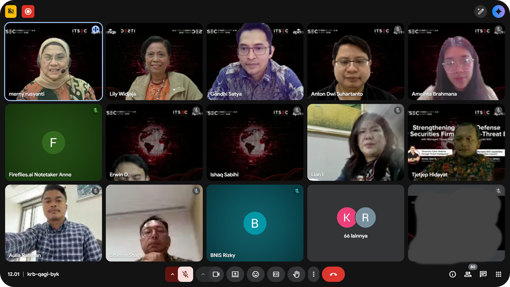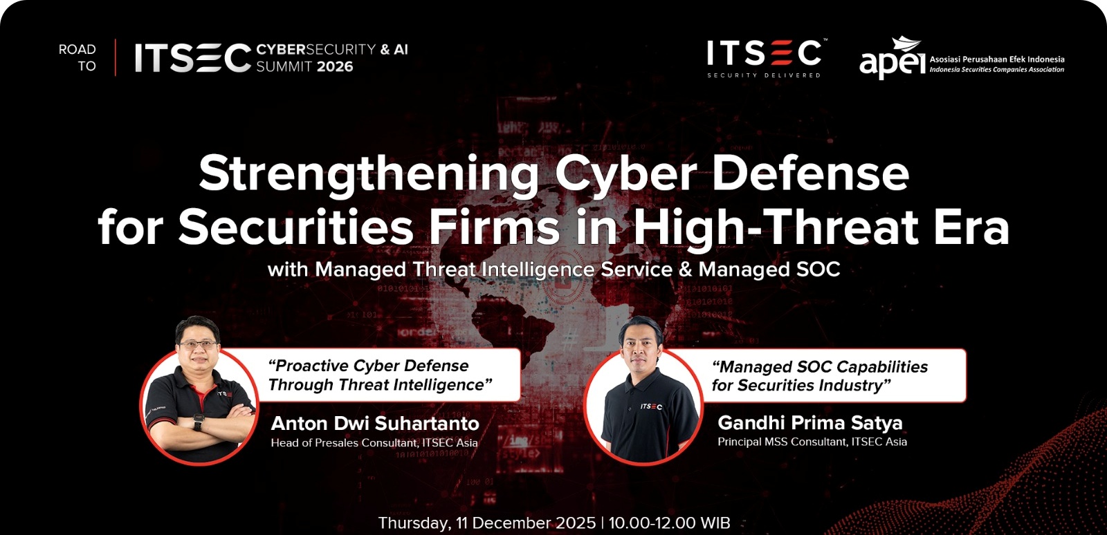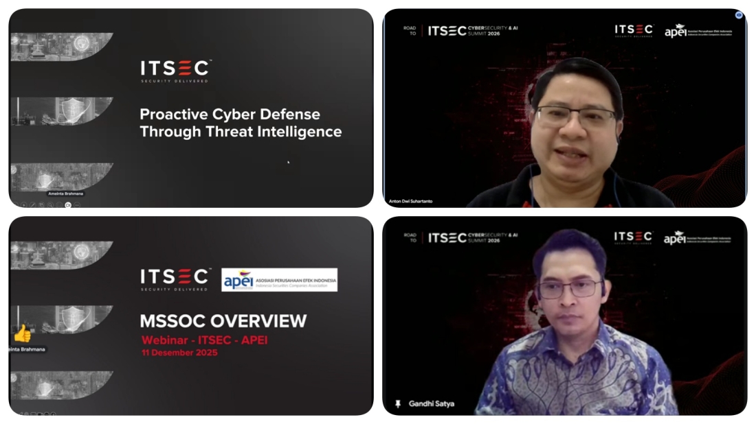 Jakarta, 11 Desember 2025 – Asosiasi Perusahaan Efek Indonesia (APEI) bekerja sama dengan ITSEC Asia menyelenggarakan webinar bertajuk "Strengthening Cyber Defense for Securities Firms in High-Threat Era", yang membahas dua topik utama: Managed Threat Intelligence Service dan Managed Security Operations Center (SOC). Acara ini berlangsung secara daring melalui Google Meet dan dihadiri oleh perwakilan perusahaan efek anggota APEI.